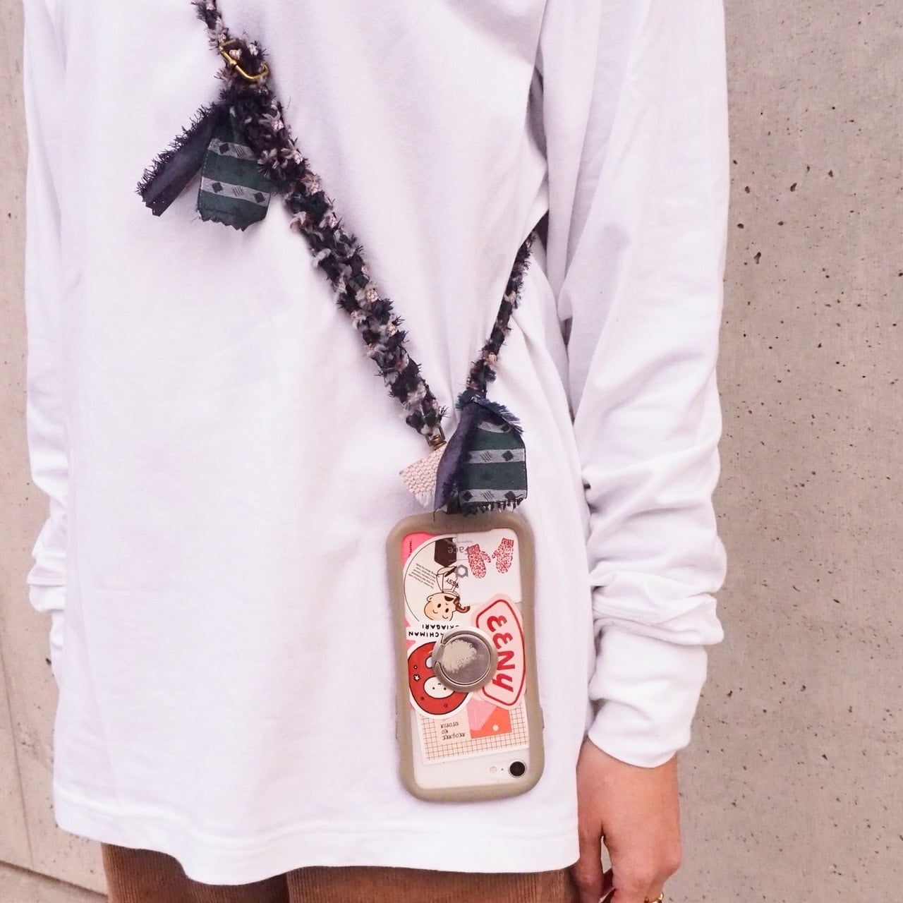 シンプルな服装にもさっと掛けるだけでアクセントになるのもこのストラップの魅力です。
