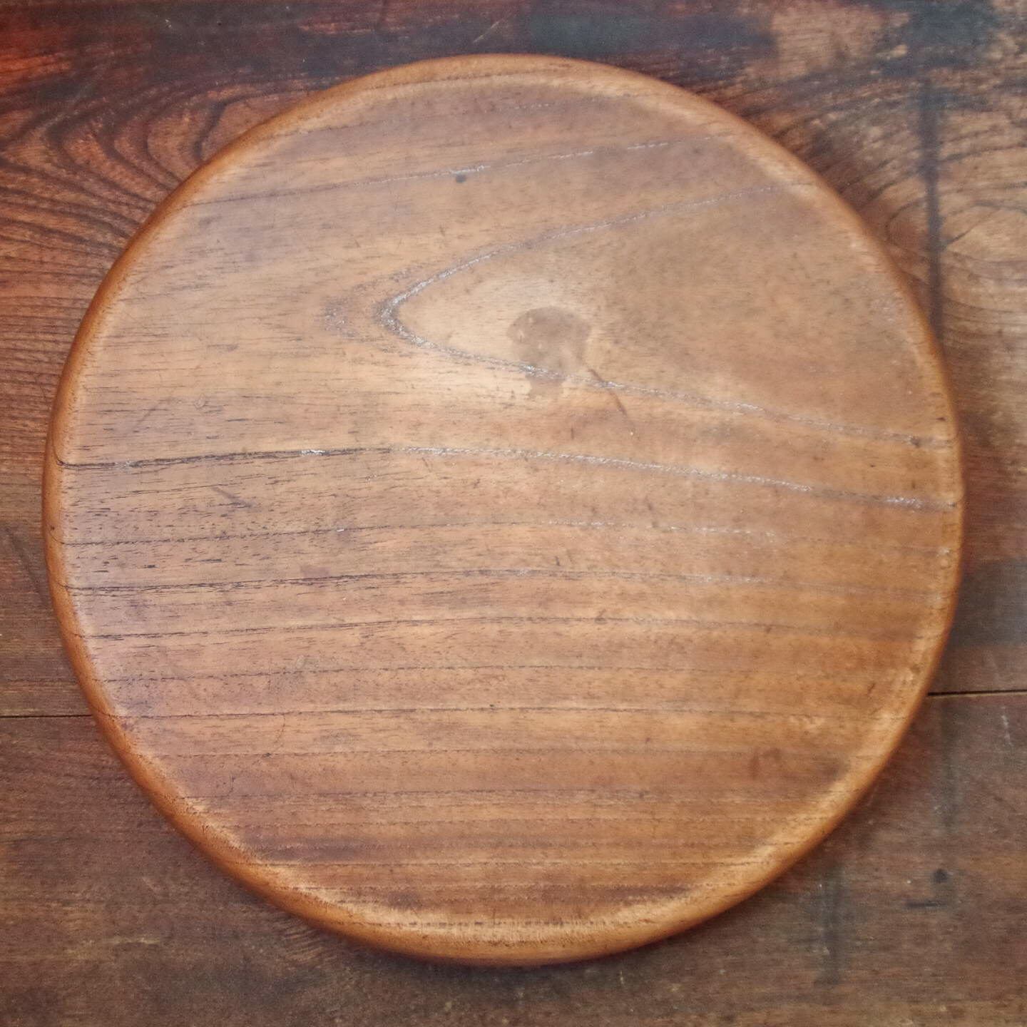 はっきりとした木目と、使い込まれて生まれた飴色の風合いが美しいくりぬき盆です。