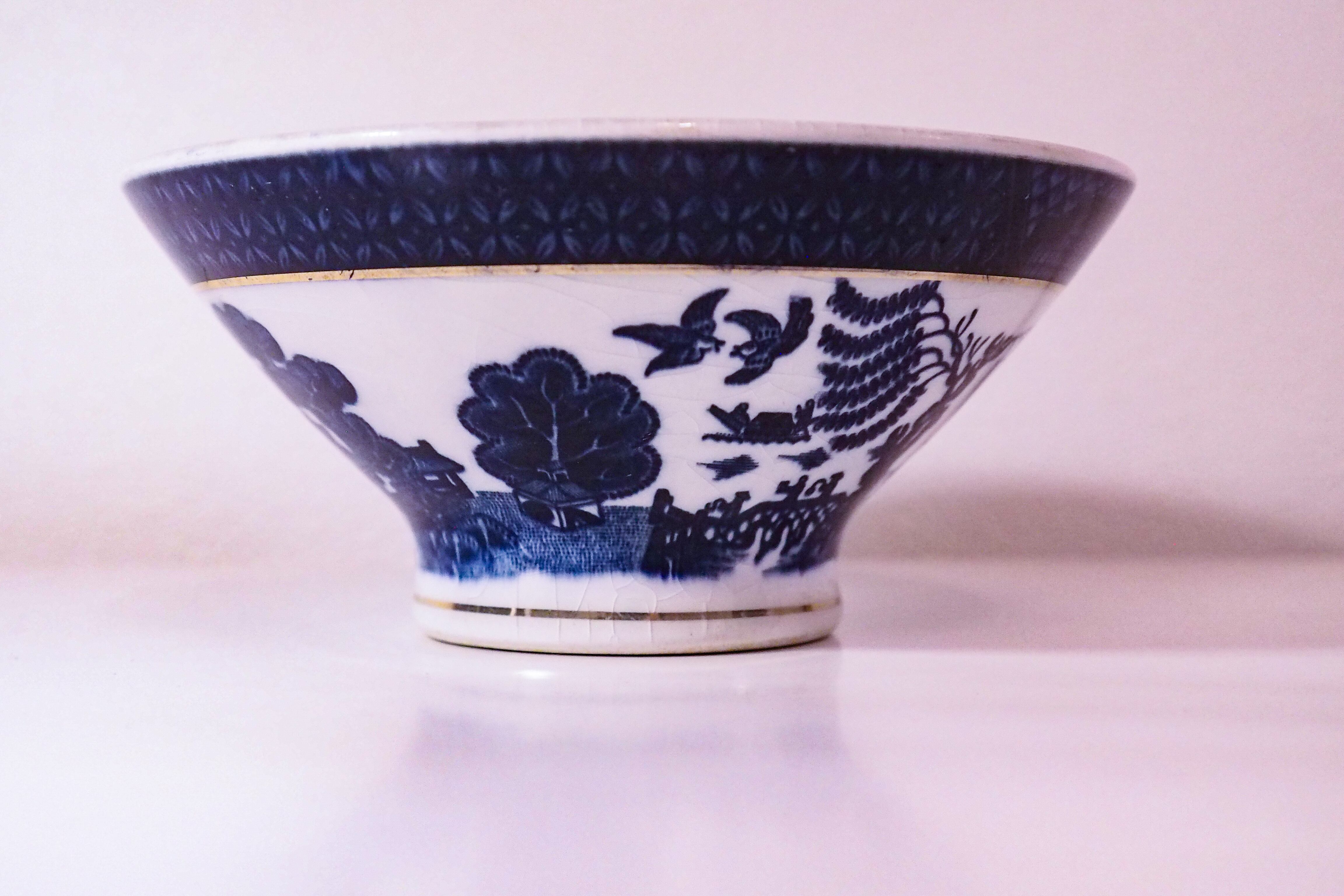 白地に青のブルーウィローという昔イギリスで誕生し、世界中で流行したデザインです。