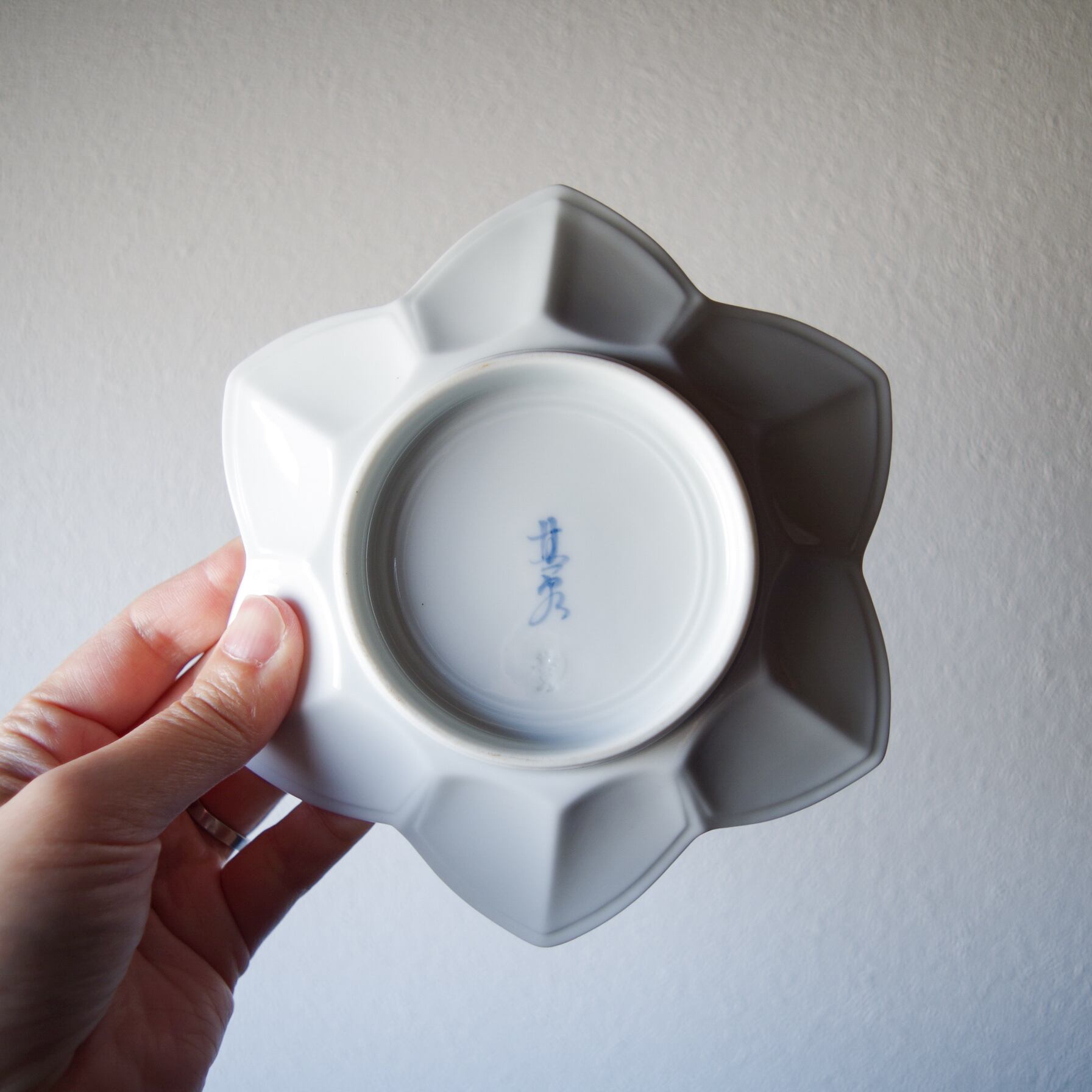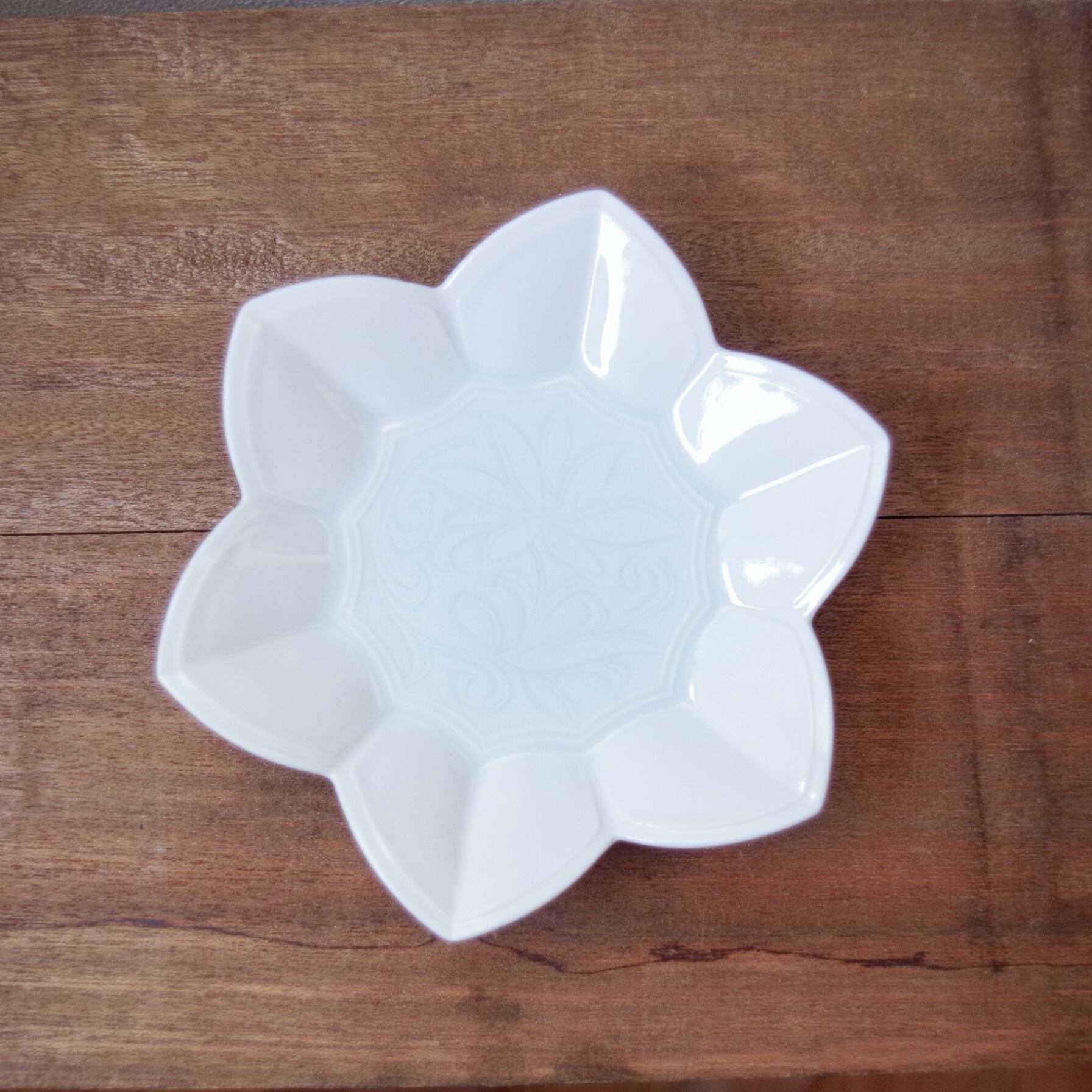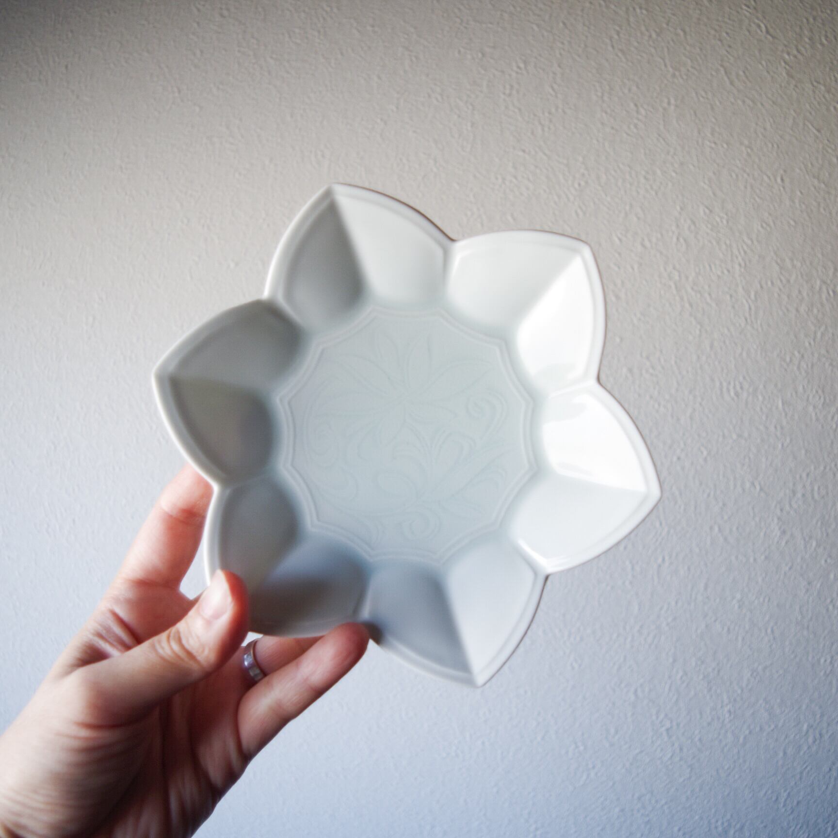 白にほんのり青みがかった絵柄の立体的で美しい器です。